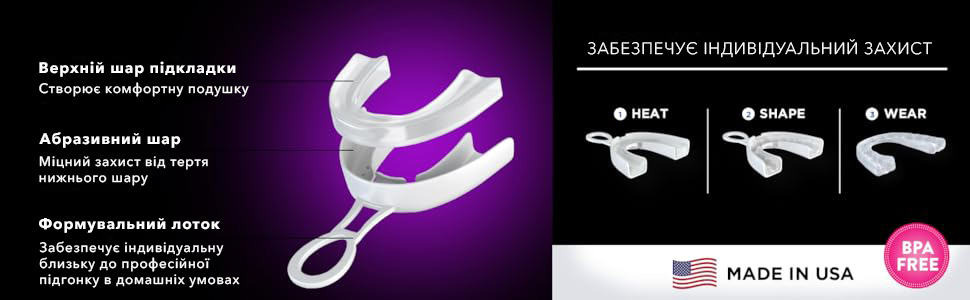 - Забезпечує індивідуальний захист на рівні, що відповідає професійно виготовленим зубним капам.