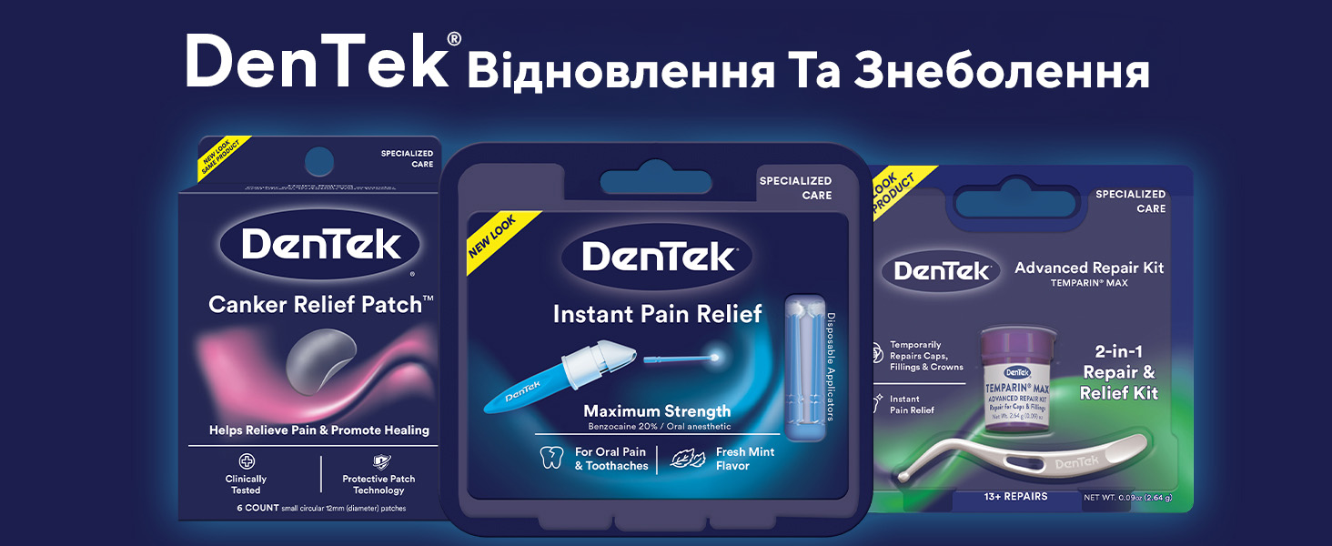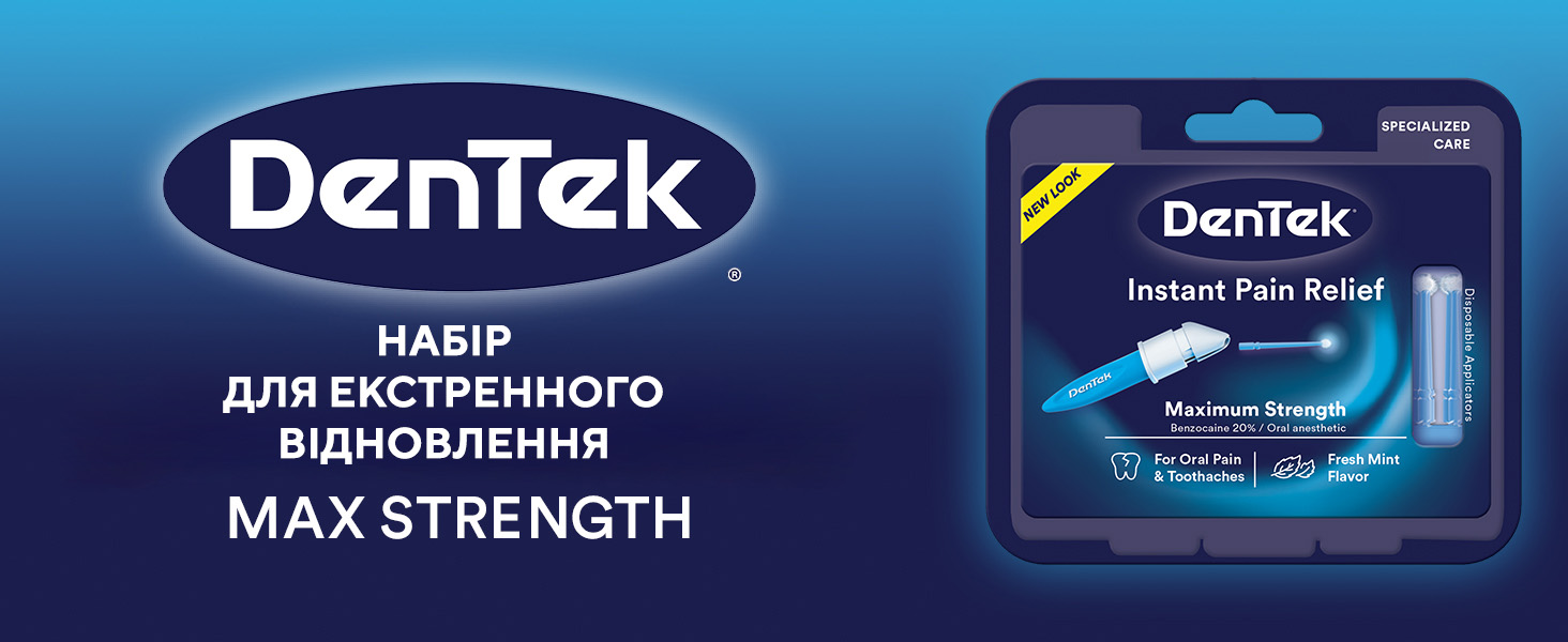 DenTek® Знеболюючий засіб миттєвої дії у розширеному наборі забезпечує швидке полегшення зубного болю. За допомогою аплікаторів одноразового використання засіб наноситься та діє точно на ділянки, в яких виник біль.
