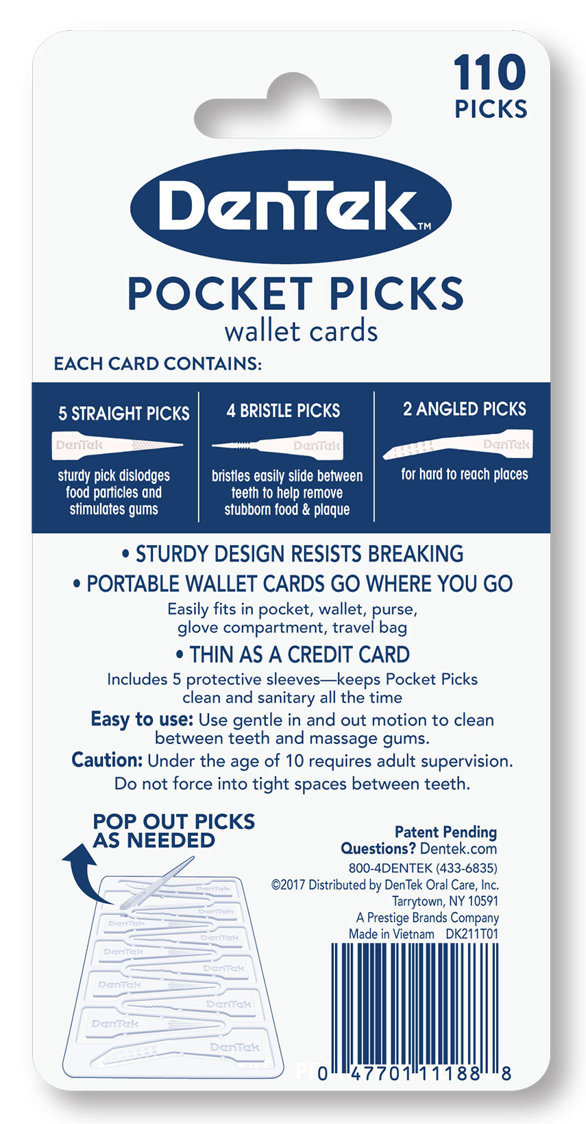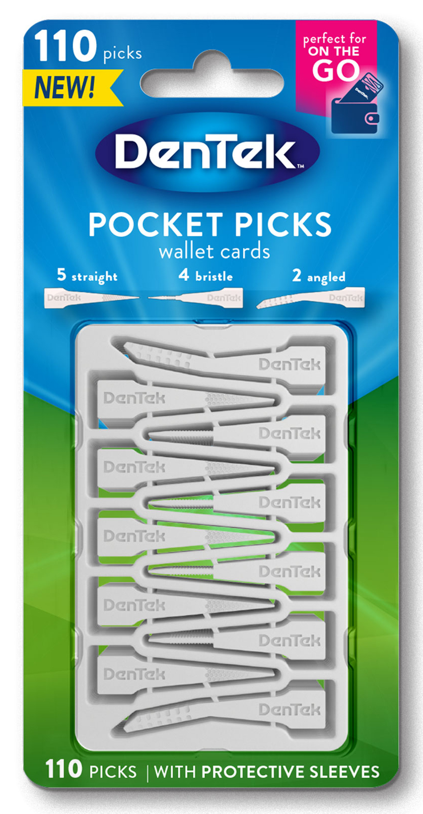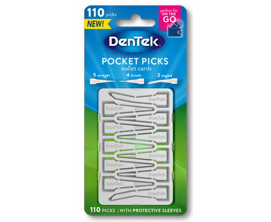 Уникальный комплект DenTek®Карманные зубочистки – это быстрое, простое и удобное решение для случаев, когда Вам необходимо очищение межзубных промежутков в дорожных условиях.