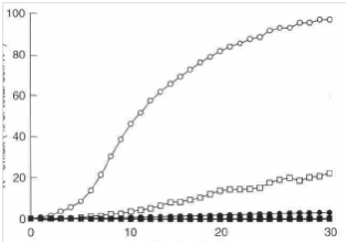 (с) C. Albicans KEM Н6:100: (О) без олії чайного дерева; (●) 0,125 об.% олії чайного дерева; (□) 0,25 об.% олії чайного дерева; (■) 0,50 об.% олії чайного дерева.