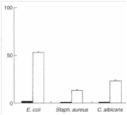 Мал. 3 Поглинання йодиду пропідію в суспензії клітин кишкової палички AG100, золотистого стафілококу NCTC 8325 та C. Albicans KEM H5. Клітини піддавалися дії 0,25об.% олії чайного дерева протягом 30 хв (□) і порівнювалися з контрольною колбою без олії чайного дерева (■). Розмір помилки представлена стандартними відхиленнями, розрахованими за даними окремих аналізів (n = 3).