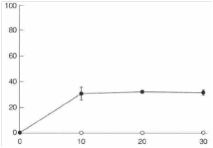 Мал. 5 Витік карбоксифлуоресцеїну з багатошарових ліпідних везикул під впливом олії чайного дерева. (О): без олії чайного дерева; (●): 0,25об.% олії чайного дерева. Розмір помилки представлена стандартними відхиленнями (n = 2).