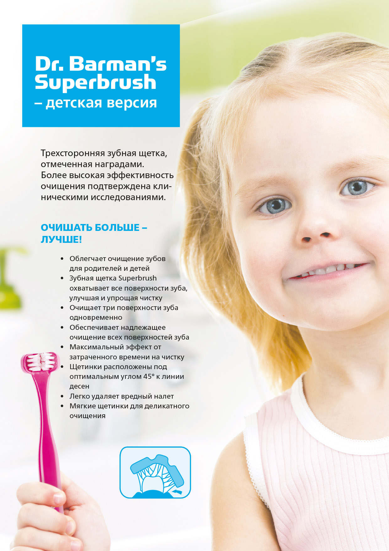 Діти часто неохоче чистять зуби, але зубна щітка Superbrush довела, що це стало простіше. Більш ефективне очищення досягається за менший час. Оскільки щетинки охоплюють зуби, легше контролювати рухи щітки і досягти хорошого результату очищення з усіх боків зуба одночасно. Дитині не потрібно відкривати рота так само широко, як при використанні звичайної зубної щітки, і це є перевагою, щоб переконати дитину почистити зуби.