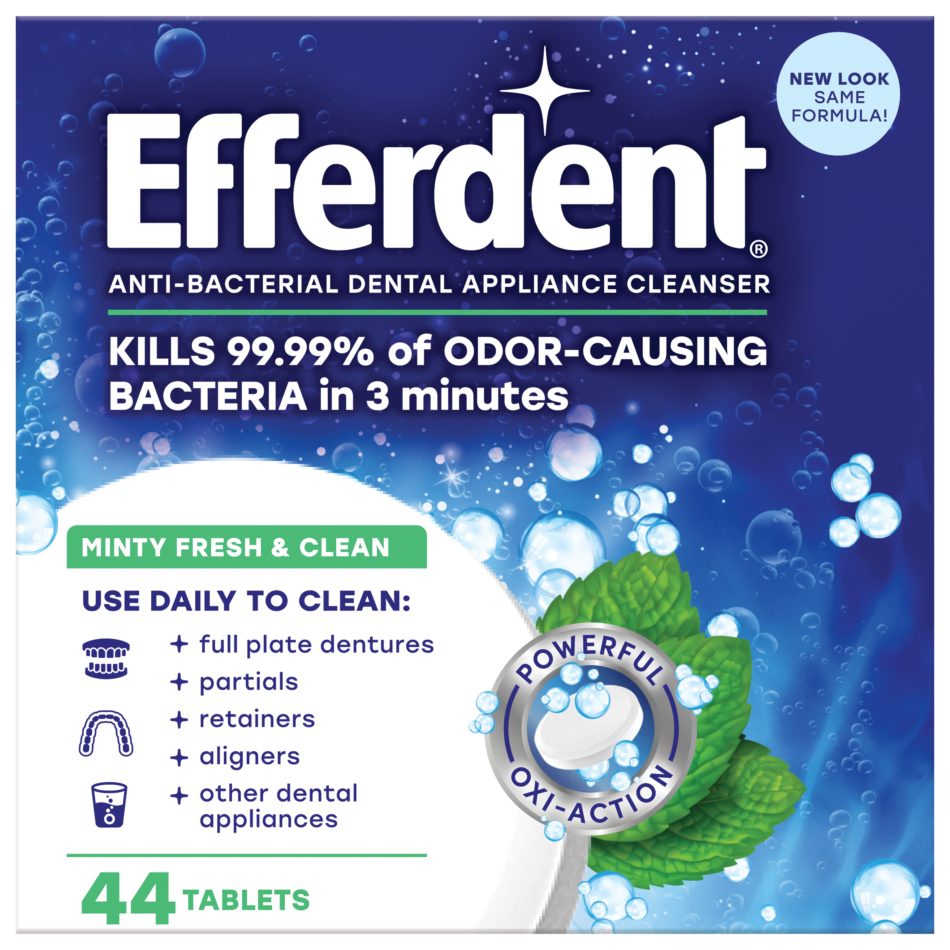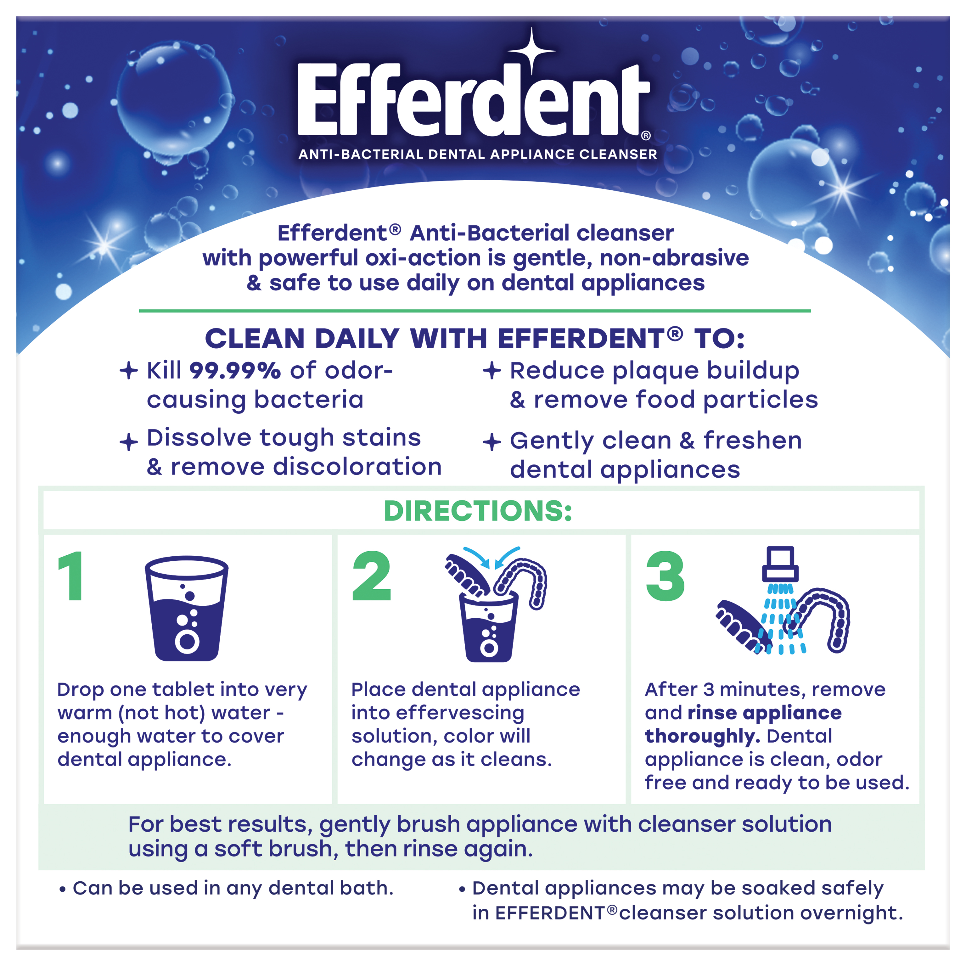 Efferdent Мятная свежесть и очищение Антибактериальные таблетки борются с образованием зубного налета и уничтожают бактерии, вызывающие неприятный запах. Всего 3 минуты, и Ваш пластиковый ретейнер или другие стоматологические конструкции станут полностью чистыми, свежими и готовыми к использованию.