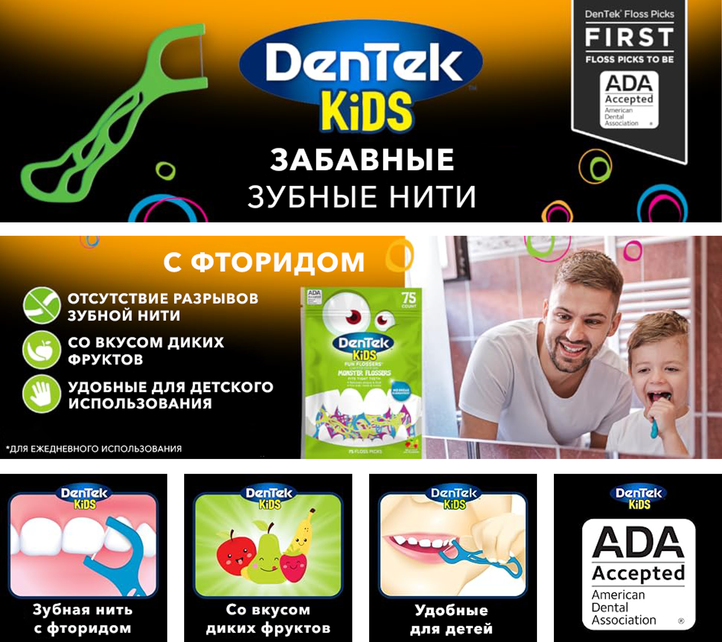 Сделайте очистку зубной нитью весельем для детей и приучите к здоровому уходу за зубами в раннем возрасте. DenTek® Детские веселые флоссы с держателем имеют уменьшенную головку, удобную ручку и аромат диких фруктов, который понравится детям.