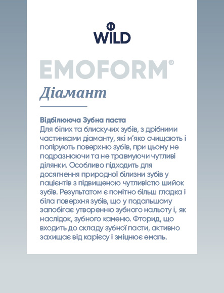 EMOFORM® Диамант Отбеливающая Зубная паста является результатом стоматологических исследований компании Dr. WILD. Она содержит мельчайшие частицы настоящего диаманта, которые мягко очищают и полируют поверхность зубов, при этом не раздражая и не травмируя чувствительные участки. Поэтому EMOFORM® Диамант; особенно подходит для достижения естественной белизны зубов у пациентов с повышенной чувствительностью шеек зубов. Результатом является заметно более гладкая и белая поверхность зубов, что в дальнейшем препятствует образованию зубного налета и, как следствие, зубного камня. Фторид, входящий в состав зубной пасты, активно защищает от кариеса и укрепляет эмаль.
