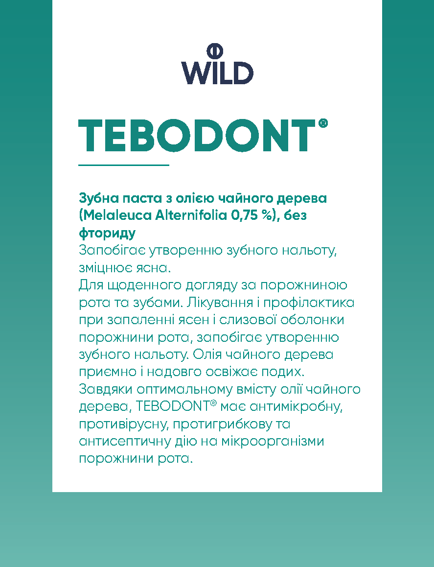 1) Исследование, проведенное Институтом Профилактической Стоматологии и Микробиологии Полости Рта Базельского Университета с использованием геля с содержанием масла чайного дерева (гель TEBODONT®) и раствора с содержанием масла чайного дерева подтвердило: