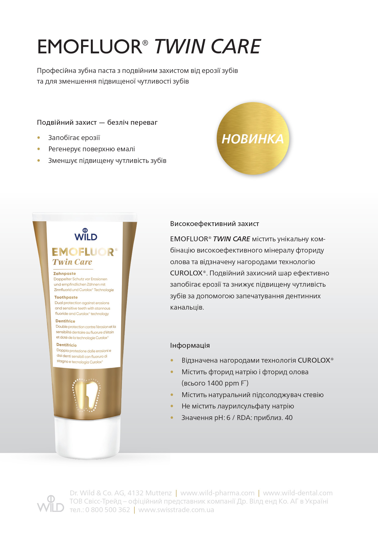EMOFLUOR® Подвійний догляд Зубна паста містить унікальну комбінацію високоефективного мінералу фториду олова та технологію CUROLOX® (самоорганізовані пептиди), удостоєної нагороди Swiss Technology® Award.