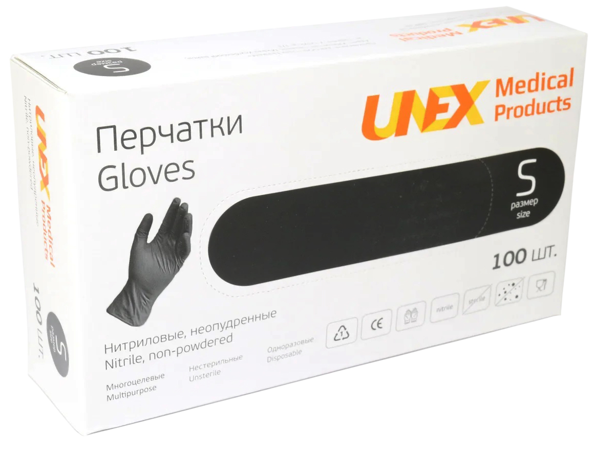 Перчатки нитриловые UNEX Medical, неопудренные, диагностические, черные, размер S, 100 шт. (50 пар)