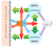 Фторид олова утворює захисний шар на поверхні дентину. Відбувається закупорка дентинних канальців, у результаті передача хворобливого імпульсу на нервові закінчення блокується. Біль запобігли. |