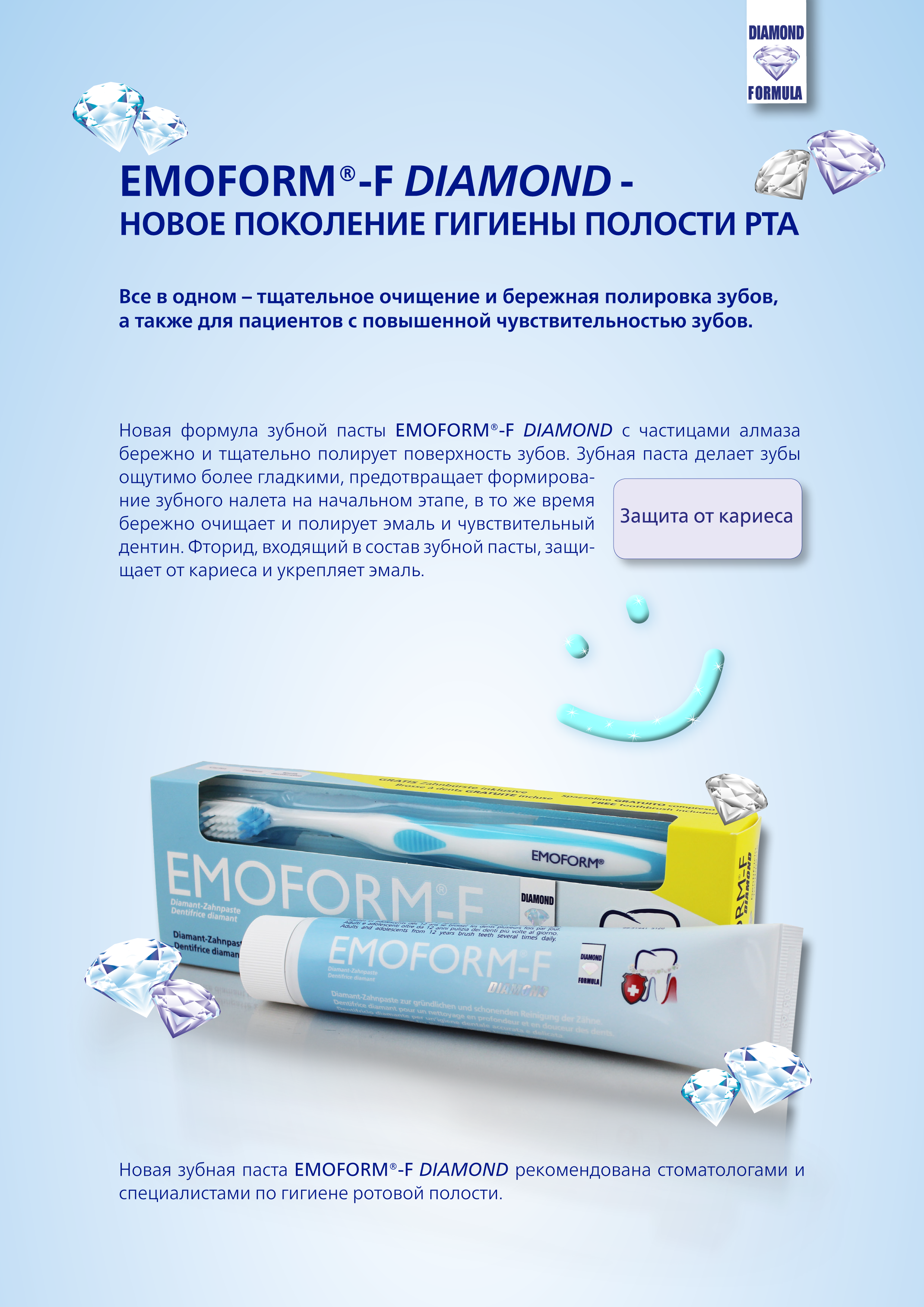 EMOFORM® Діамант Відбілююча Зубна паста є результатом стоматологічних досліджень компанії Dr. WILD. Вона містить найдрібніші частинки справжнього діаманту, які м'яко очищають і полірують поверхню зубів, при цьому не дратуючи та не травмуючи чутливі ділянки. Тому EMOFORM® Діамант особливо підходить для досягнення природної білизни зубів у пацієнтів з підвищеною чутливістю шийок зубів. Результатом є помітно гладкіша і біла поверхня зубів, що надалі перешкоджає утворенню зубного нальоту і, як наслідок, зубного каменю. Фторид, що входить до складу зубної пасти, активно захищає від карієсу та зміцнює емаль.