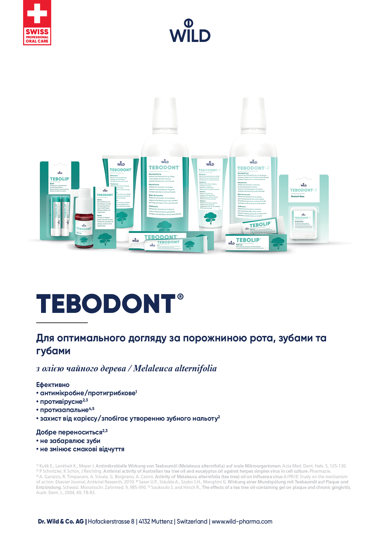 1) Дослідження, проведене Інститутом Профілактичної Стоматології та Мікробіології Ротової Порожнини Базельського Університету з використанням гелю з вмістом олії чайного дерева (гель TEBODONT®) та розчину з вмістом олії чайного дерева підтвердило: